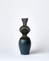 A striking vessel combining an intricately carved ceramic base in white with painstakingly hand-looped copper wire, which has been oxidised to a black finish.