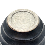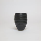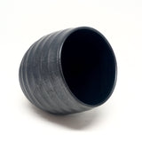 A curved cup with horizontal grooves creating rings around the outside of the cup and finished in matte black.