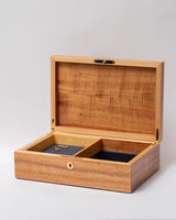 Tasmanian Fiddleback Blackwood, with a feature lid panel arranged in a fan pattern with Huon Pine inlayed edge detail.