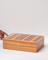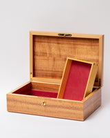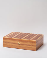 Tasmanian Fiddleback Blackwood, with a feature lid panel arranged in a strip pattern which highlights lighter coloured sap wood, with an inlayed Huon Pine edge.