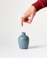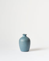 A medium budvase with an intricately hand carved surface, glazed in a deep cobalt blue satin matte glaze.