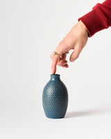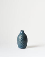 A medium budvase with an intricately hand carved surface, glazed in a deep cobalt blue satin matte glaze.