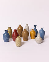 A small budvase with an intricately carved surface, glazed in a warm sandstone satin matte glaze.