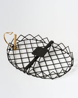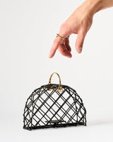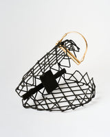 This compact matt black, zinc-plated purse takes inspiration from the dangerous bear trap. Although less dangerous, it does suggest consumption can trap us. A gold-plated D-clip allows for quick release and simple fastening, whilst also acting as a tidy handle.