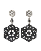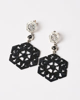 These bold and intricate earrings are inspired by the stunning micro-crystalline structure of ice, and the exquisite geometries of nature. Lightweight on the ears and handcrafted with the signature Aurelia Yeomans kiln-fired black enamel finish, they feature mild steel hexagon drops and natural black spinel gemstones set into hammered, partially blackened and polished sterling silver.