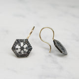A pair of earrings with 9ct yellow gold hooks and hammered, oxidised and polished sterling silver drops.
