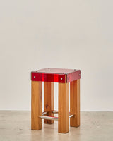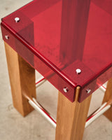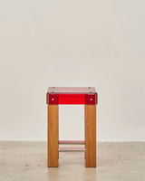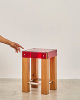 A small table stool with contrasting textures of rich solid timber, shiny red acrylic, polished stainless steel and a splash of cork. The acrylic seat is bent over all four sides of the stool and fixed to the Queensland Maple legs with plastic mirror nuts. Billy’s little stools are a playful combination of materials including folded acrylic, premium hardwood, soft cork and cheap plastic nuts. Inspired by luxury design, functional furniture and effective manufacturing techniques the stools are the result of many iterations of a particular fixing technique involving three corners of a cube.