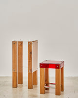 A crisp and clean bar stool with clear acrylic folded over the front and back of four bold solid timber legs. A handle on the back and a thick acrylic rod foot rest make the stool sturdy and practical as well as striking. Billy’s little stools are a playful combination of materials including folded acrylic, premium hardwood, soft cork and cheap plastic nuts. Inspired by luxury design, functional furniture and effective manufacturing techniques the stools are the result of many iterations of a particular fixing technique involving three corners of a cube.