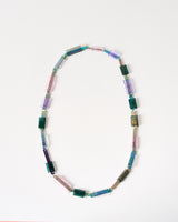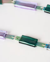 The materials used these necklaces are combinations of coloured borosilicate glass, anodised titanium and 925 silver. Each necklace is made of multiple handmade and laser cut components, assembled with 925 silver wire links.