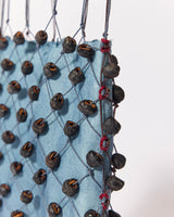 Named after Laddawan’s mother, Mali is a handmade ornamental bag. Born in Thailand in the 1960s, her mum Mali and uncle Kim lived in Bangkok on the edge of a banana plantation. On a trip to Thailand in 2024, the artist learned about the use of banana seeds in beading, and how to make traditional mulberry paper, as ways of connecting to her mother and learning something of the material and spiritual context of her upbringing. In this work, the bag symbolises an object that both carries and is carried from one place to another; a vessel that contains histories and futures. Similarly, the banana seeds are naturally unfixed travelling entities that themselves contain living stories. This work draws connections between the carrier bag, migration routes, and the stories that are contained within organic materials.