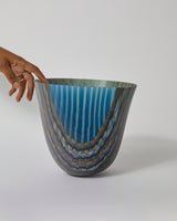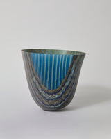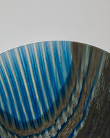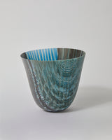 Aqueous Blue #1 is an art piece using the Murrini technique. It is made with sheets of coloured glass that are stacked together then heated and stretched. it's subtle organic shape is formed in a kiln using gravity and heat.