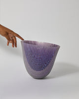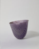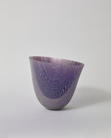 Aqueous Purple #1 is an art piece using the Murrini technique. It is made with sheets of coloured glass that are stacked together then heated and stretched. it's subtle organic shape is formed in a kiln using gravity and heat.