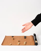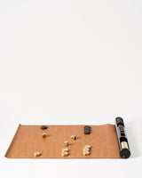 Featuring a laser-etched leather roll, hand-stitched and set into a custom gloss black resin holder, this portable set comes with slots to neatly hold the solid brass tokens and dice. It is the one rollup that you can’t eat.