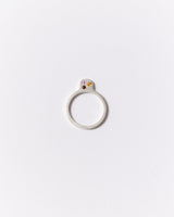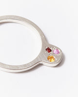 The Three Sisters Ring features a unique two dimensional profile. Crafted from stirling silver, it is grain set with three colourful stones and finished with a polished comfort fit.