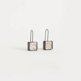 A small pair of open cube earrings filled with mica. Made from oxidised sterling silver featuring a hook fitting.