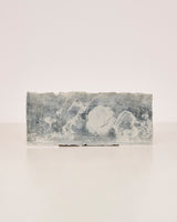Each sculptural tile is made of waste glaze, oxide and porcelain material blends. The blue-grey hues are generated from the presence of cobalt and copper in the accumulated waste glaze from class experiments conducted at the School of Clay and Art, where the artist works as a teacher. There is waste material in both the clay body and the surface. All images were printed in waste glaze pre-firing with a paper lithography technique, then single fired.