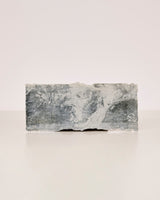 Each sculptural tile is made of waste glaze, oxide and porcelain material blends. The blue-grey hues are generated from the presence of cobalt and copper in the accumulated waste glaze from class experiments conducted at the School of Clay and Art, where the artist works as a teacher. There is waste material in both the clay body and the surface. All images were printed in waste glaze pre-firing with a paper lithography technique, then single fired.