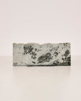 Each sculptural tile is made of waste glaze, oxide and porcelain material blends. The blue-grey hues are generated from the presence of cobalt and copper in the accumulated waste glaze from class experiments conducted at the School of Clay and Art, where the artist works as a teacher. There is waste material in both the clay body and the surface. All images were printed in waste glaze pre-firing with a paper lithography technique, then single fired.