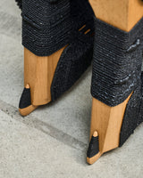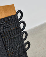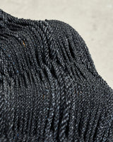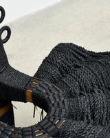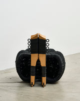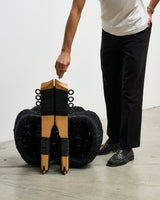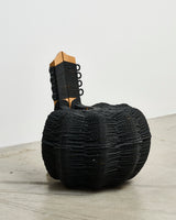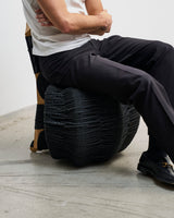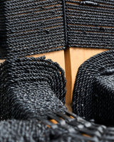 Waka, from Naarm based interdisciplinary designer/maker Avendaño Hazbún, uses the chair's structure and instinct to weave rubber rope made from recycled tyre inner tubes to cover and transform an existing chair into a completely new work.