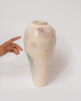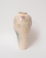 Vase #7 is a stoneware vessel featuring small attachments layered in pearl lustre. Hand-thrown and fired multiple times to create a depth of surface, the vase is watertight and can be washed with hot water.