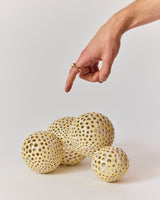 "This work is a collaborative project between myself and clay, capturing the chemical reactions that occur when craftsmanship meets art. Every step of the process is carried out at the leather-hard stage, and when everything aligns perfectly, the result is a piece that exudes a lightness—so delicate that one can glimpse the other side—while retaining the tactile qualities of ceramics." - Keiko Sato.