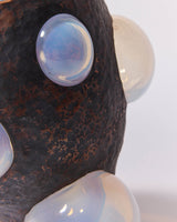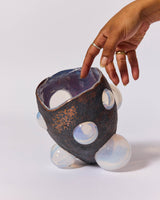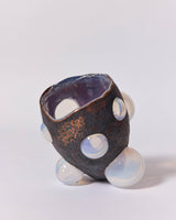 This series comprises of hybrid organic forms, crafted with metal and glass, that evoke dualities such as pleasure and discomfort, or containment and release. Each piece serves as a container of stories, emotion and memory, where expanding bubbles of glass push against the constraints of forged metal.