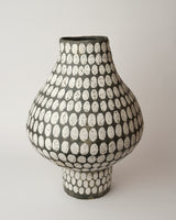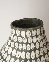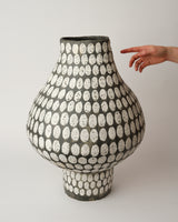 She hand builds her pieces, which are often large in scale, and is primarily concerned with exploring the aesthetics of the vessel form and in the surfaces of her pieces through mark making and texture.