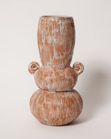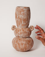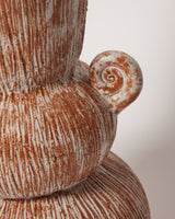 Large vessel hand made in 3 sections and assembled with 2 spirals added on. Inspired by neolithic pottery shapes. It is watertight.