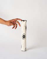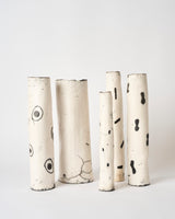 These raku cylinders by Sydney based artist Lia Klugman explore the intersection of control and chance through a traditional Japanese pottery technique. The cylindrical form provides a simple yet dynamic canvas for the unpredictable effects of fire and smoke. Each piece capturing the beauty of imperfection, embracing the wabi-sabi philosophy of finding grace in flaws and transience. Through these cylinders, Lia celebrate the interplay of earth, air, fire, and water, creating art that reflects the raw, transformative beauty of nature and the quiet acceptance of impermanence and unpredictability.