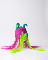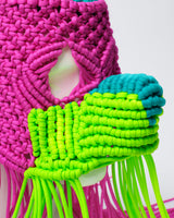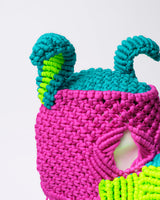 This hood is part of an ongoing installation series, DISPLAYS OF AFFECTION, which explores the intersection between the function and craft of macramé and the aesthetics and dynamics of rope bondage to explore the body, desire, kink and queerness. The series is a way to untangle non-normative intimacies in the public space and rethink the practice and transmittance of consent, pleasure and wisdom between bodies, generations and species.