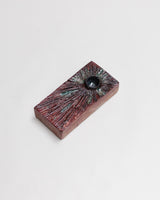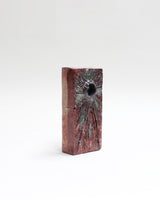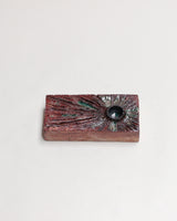 Material: solid carved Brick black Mid Fire Clay form with reclaim Oxide/ Tin Glaze and broken glass.