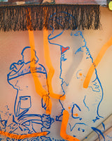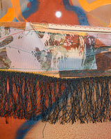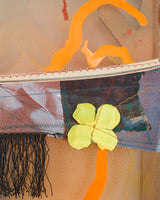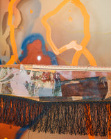 Material: acrylic, ink and pigment on silk, laser-cut brackets, fabric, fringe, plastic flower