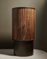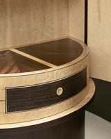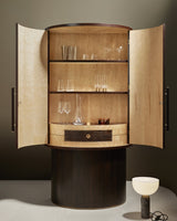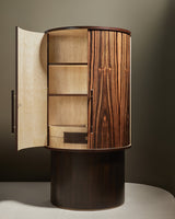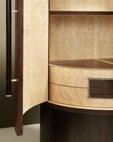 Made with a high degree of difficulty, Ross has reworked traditional forms by embracing materiality and form with a strong reference to art deco styling. All wood grains in this 'Cocktail Cabinet' have been carefully selected and book matched to complement the curve and overall design of the work, with the contrast of the Birds Eye maple, a particular favourite of the incredibly skilled cabinet maker.