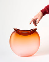 Ruth Allen's latest design blends bold form with masterful technique. Blown with four gathers of molten glass in rich primary and autumnal hues, the Luscious Lip Vase begins as a large sphere, carefully flattened with cork paddles before moving onto a solid rod. From there, the magic unfolds.
