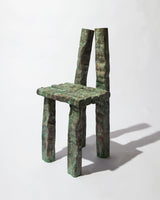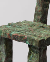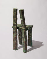 Shaped by a many-toothed grinder from a recycled Oregon beam, the first piece is rendered with a gleaming richness, its burnt ochre the result of a multi-layered application of stains added one drop at a time. Its rudimentary form reflects the practice of its maker, its shape revealed as Scotty engaged in a process of unintentional restoration to overcome a creative block by unlocking rigid thinking through the freeing euphoria of physicality. The second piece, a patinated copper chair, has the impression of petrification. Its moss sheet colouring and crumpled lines give a timeworn impression reminiscent of a keepsake that lives in the garden, drawn out time and again for the enduring ritual of storytelling.