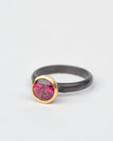 Pink rhodalite garnet with 18ct gold setting on a oxidised silver band.