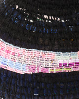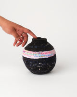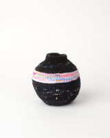 Promise Ring I serves as a departure from Sienna's usual basket-making practice, by incorporating beads. Sitting atop this hand-woven form, thousands of clear and metallic beads form a band around the vase's body. When shone at with a bright light (like the flash of a camera), the beads appear completely transparent, revealing the colours underneath. Spanning dozens of hours of work, this piece seeks to interrogate the preciousness of "women's work" and the value of the handmade in a world where so much is automated or artificial (including intelligence). Like a piece of heirloom jewellery, this is a treasured piece, to be passed down to the people you love.