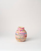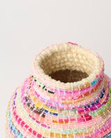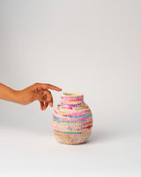The Heirloom Vase serves as a slight departure from Sienna's usual basket-making practice, by incorporating beads. The bottom half of this (non-functional) vase is made using handwoven yarn, while the top half is constructed using plain gauze bandages. Using beads to imitate the organically created stitches on the bottom half, this piece plays with the concepts of imitation and replicas. Standing at a distance, you might not notice that it features so many beads - like looking at an impressionist painting from afar, only to see that it's made of many tiny marks.