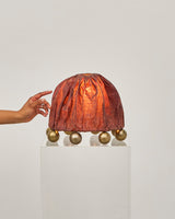 Handcrafted by the alchemy of sand-cast metal and beeswax-coated linen, the Alter table lamp symbolises the unity of matter, spirit, and energy. These sculptural light works take their form from alchemic symbols. Like alchemy, which transforms matter and spirit, Kaytar’s process aims to change materials and imbue them with new life. The spheres are solid metal, hand sand-cast, and left raw to develop a natural patina with a living presence. The shade, constructed from flax linen, has been plant dyed with ceriops and coated in beeswax to create a sculptural quality that emits the soft scent of beeswax to delight the senses. The circular form and materials used in the Alter works represents completeness and unity, symbolising the constant transformation and evolution of matter and energy. The solid metal spheres reflect the idea that all elements and forces in the universe are part of a greater whole, embodying the eternal cycle of creation, destruction, and transformation.