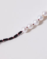 This unisex 'Delaunay' pearl and black agate necklace, incorporates classic pearls with an Art Deco aesthetic to create a bold A-symmetrical piece on vibrant red silk. As the thread is silk, it is best not worn in water.