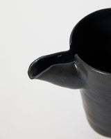 A pouring vessel with indents to allow for easy gripping. The vessel features a short spout and has a matte black finish.