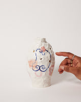 A unique and colourful handbuilt clay body vessel with handles, finished with a warm glaze and lustre by Tessy King.