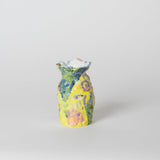 A unique handbuilt bud vase finished with colourful glaze by Tessy King. Yellow vessel with layered mixed glazes and lustre.