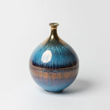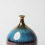 Wheel thrown porcelain vessel 'Shades of Gold' with blue drip.