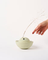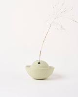 This bud vase has a bold, sculptural presence, with a smooth, domed upper form resting atop a rounded base. The vase is treated with liquid quartz and waxed to ensure it is watertight. Can be cleaned with warm water.