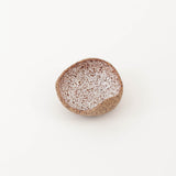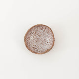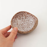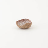 A small hand built, vessel with an exaggerated, asymmetrical lip around the edges. Finished with a speckled white interior and brown-speckled exterior. Due to the handmade nature of this item, variances may occur between pieces