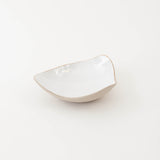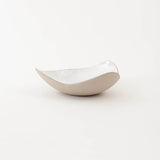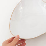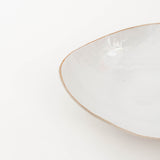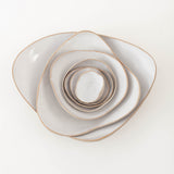 A flat, hand built vessel with a sculpted asymmetrical edge. Finished with a white glazed interior and a subtly speckled grey exterior. Beautiful as a standalone piece or as part of a stackable set featuring other Tracy Muirhead vessels. Due to the handmade nature of this item, variances may occur between pieces.