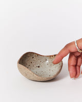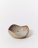 A hand built, flat vessel with an organically sculpted lip around the edges. Finished in speckled speckled grey interior, with a partially visible, brown-speckled base. Beautiful as a standalone piece or as part of a stackable set featuring other Tracy Muirhead vessels. Due to the handmade nature of this item, variances may occur between pieces.