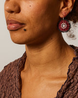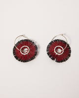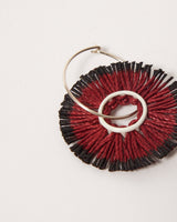 A unique pair of statement fringed earrings in red linen with hand dyed grey tips woven onto a beige powder coated brass. They swing gently on sterling silver hoops.