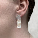 Clean lines highlight the natural beauty of silver & pearls. Continuing the story of the To Hold range, the shape derives from the clear space of the range’s necklace and ring, the precious implied half, the invisible self, the dream. The striking solid top will catch the light as the gently articulated pearls emit a warm glow. As with all VMJ pieces, each part of this design has been carefully structured and meticulously finished.